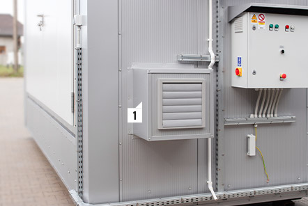 Wentylacja mechaniczna zapewniająca odpowiednią cyrkulację powietrza zakończona klapą p.poż. Praca cykliczna zaprogramowana na 5 wymian powietrza na godzinę. Klapy przeciwpożarowe mające na celu odcięcie dopływu powietrza przy otworach wentylacyjnych w przypadku powstania pożaru. Klapy certyfikowane na zgodność z EN 15650. Mechanizm wyzwalająco-sterujący uruchamiany samoczynnie z=po zadziałaniu wyzwalacza termicznego. Wyzwalacz RST.