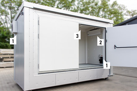 Wykonane z płyty warstwowej ściennej jak i dachowej, wełna mineralna EI120 160mm. Zabezpieczenie antykorozyjne w klasie C4. Dach ze spadkiem zakończony rynną z rurą spustową.